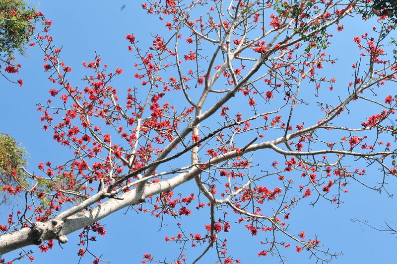 咦,春天來了。這粗糙且?guī)Я龃痰能|干,干枯的樹枝,雖然挺拔,但總歸突顯蒼老。不曾想,這毫不起眼的枯樹,卻在這春意盎然的雨天,綻放出火焰般的生命,這突如其來的綻放似那騰空而起的煙花,一樣的耀眼卻不一樣的安靜。駐足凝視,這碗大的花朵,恰似染紅的羽毛球,五片擁有強(qiáng)勁曲線的花瓣,包圍一束綿密的黃色花蕊,收束于緊實(shí)的花托。此花素而不艷、嫩而不嬌、爽而不躁,撩我心弦,卻道不出為何花。心動(dòng)而好奇,好奇而愕然。路人甲“哎,那是木棉花,英雄花”。驚愕,卻也高興,雖不識廬山,但總歸能為其巍峨、壯麗而吸引。